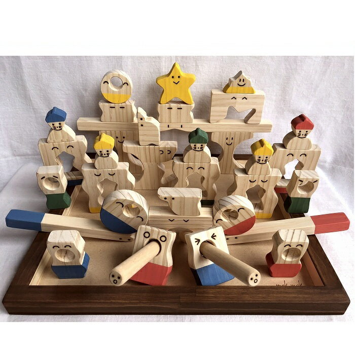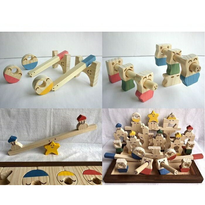 わいわい積木遊び(お話しながら楽しく想像&バランス)・コロコロ転がし遊び(起き上がりこぼしで面白く転びます)・ポコポコ穴通し遊び(積木の穴に棒を通します)・シーソー遊び(星とバランスバーを使い積木をのせてシーソー遊び)・型合わせパズル遊び(形をおぼえながら頭の体操&集中力)。