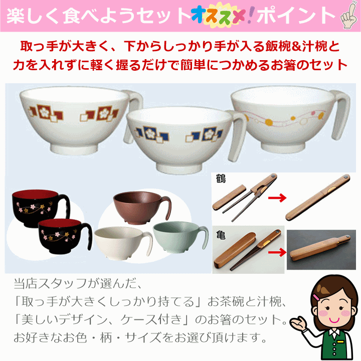 楽しく食べよう 所作セット【介護用はし 介護用茶碗 介護用おわん 介護 箸 介護 茶碗 介護 おわん 介護用 はし 介護 ちゃわん 高齢者用はし 高齢者用茶碗 高齢者用おわん プレゼント 贈り物 取っ手 おはし 介護お箸 介護 お椀 お箸セット お茶碗セット】
